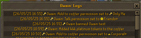 This quality of life feature tracks every permission change or tokens removed / added to the clan's coffer and is only available to be viewed by the owner of the clan.